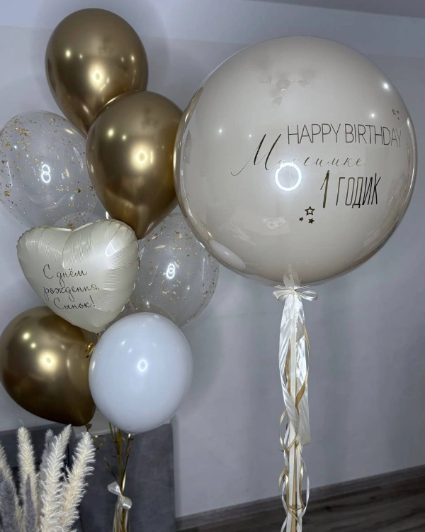 - Крупный размер — около 60 см. Стоимость составляет примерно 2200 рублей. Этот размер позволяет размещать большие надписи, фотографии, использовать широкие ленты, фатин и мини-фигурки.